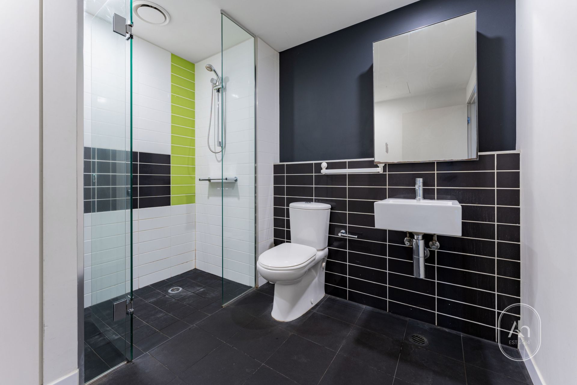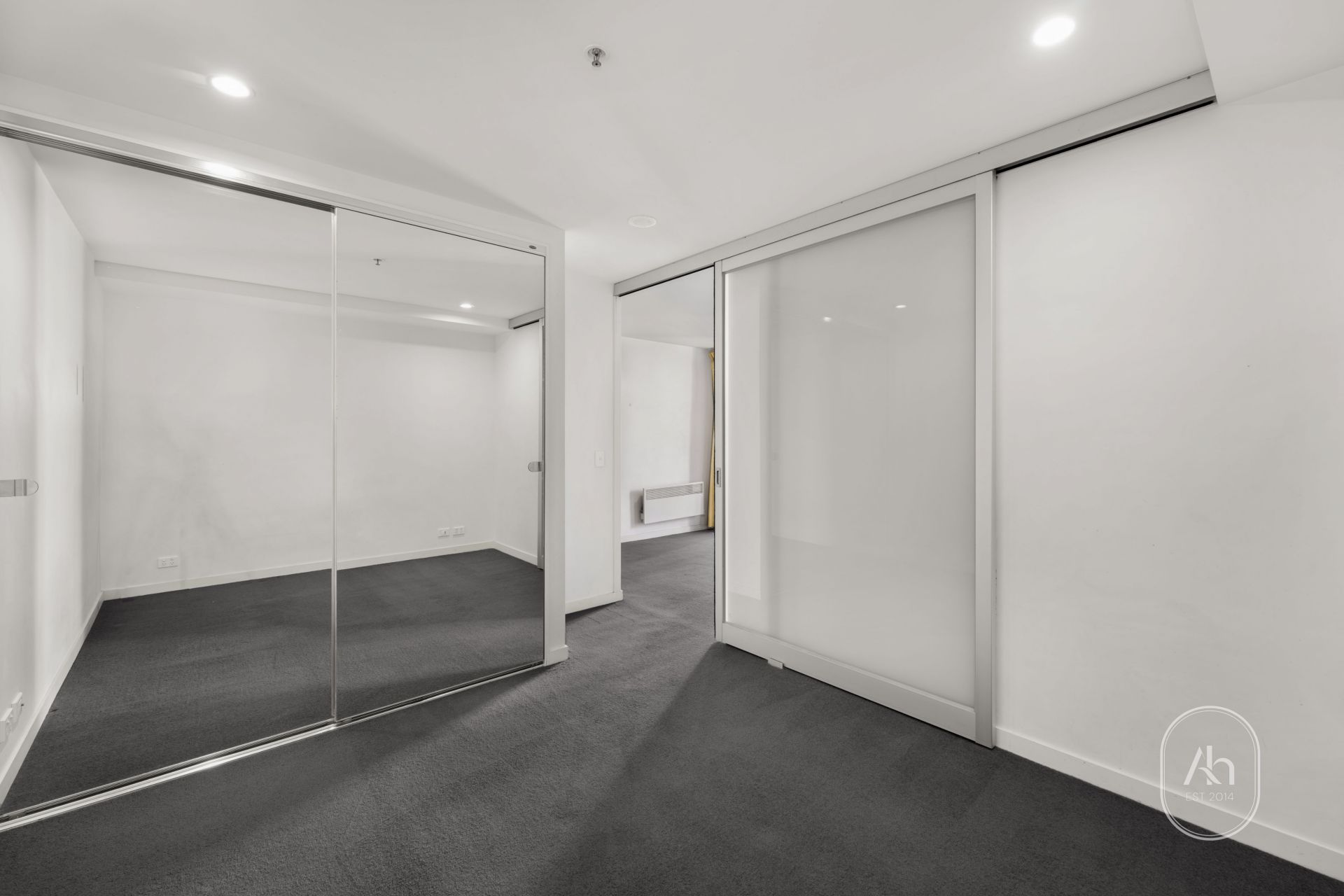 Both bedrooms are generously sized and include built-in wardrobes, while the central bathroom is sleek and modern with quality finishes. The apartment provides a comfortable living environment with a focus on practicality and style.