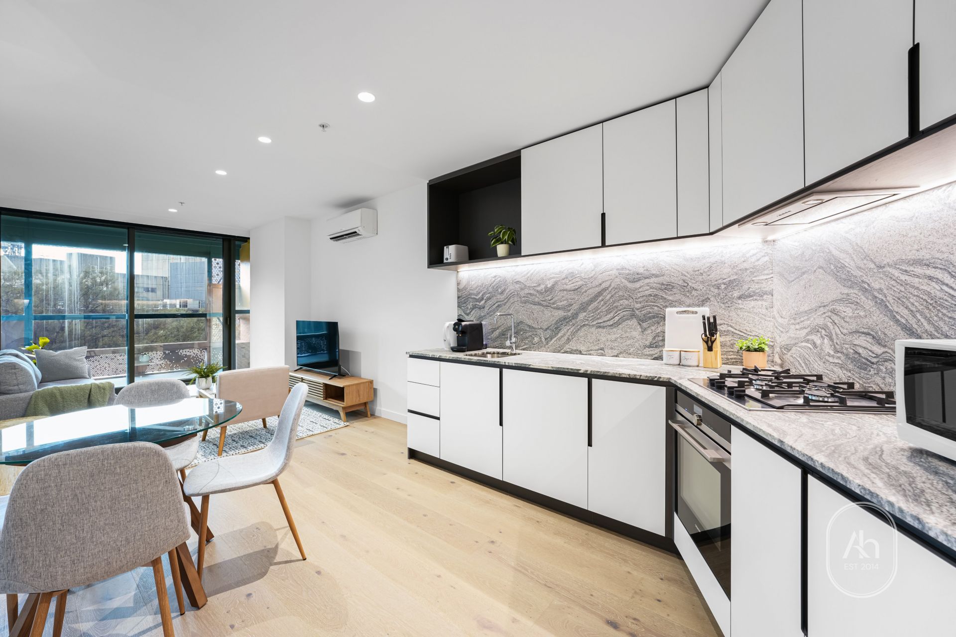 The generous sized living room is filled with natural light and flows onto the balcony. The kitchen is state of the art with stone benchtops, an abundance of pantry space and stainless steel appliances including oven, 4 burner gas cooktop and dishwasher.
