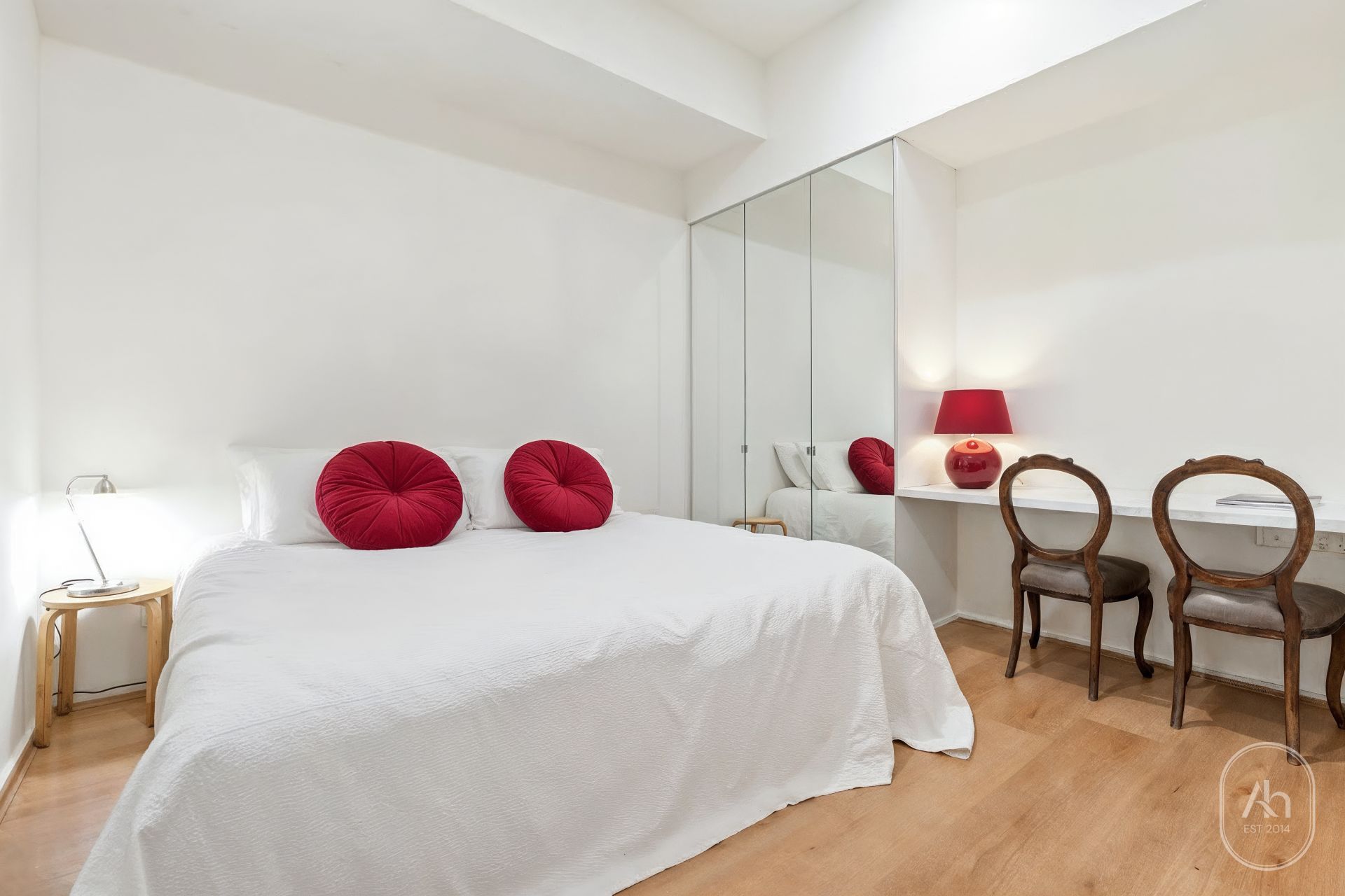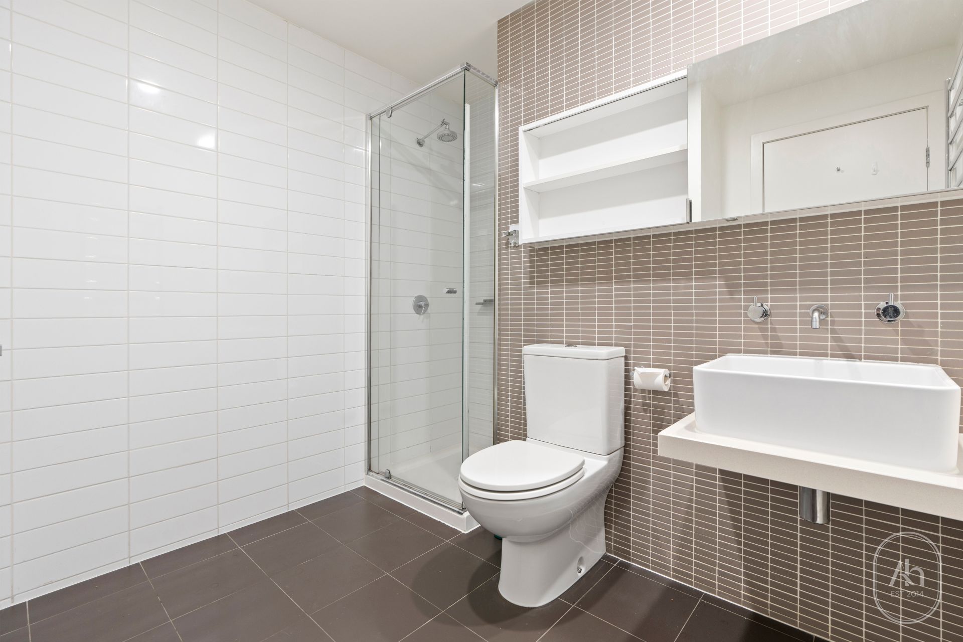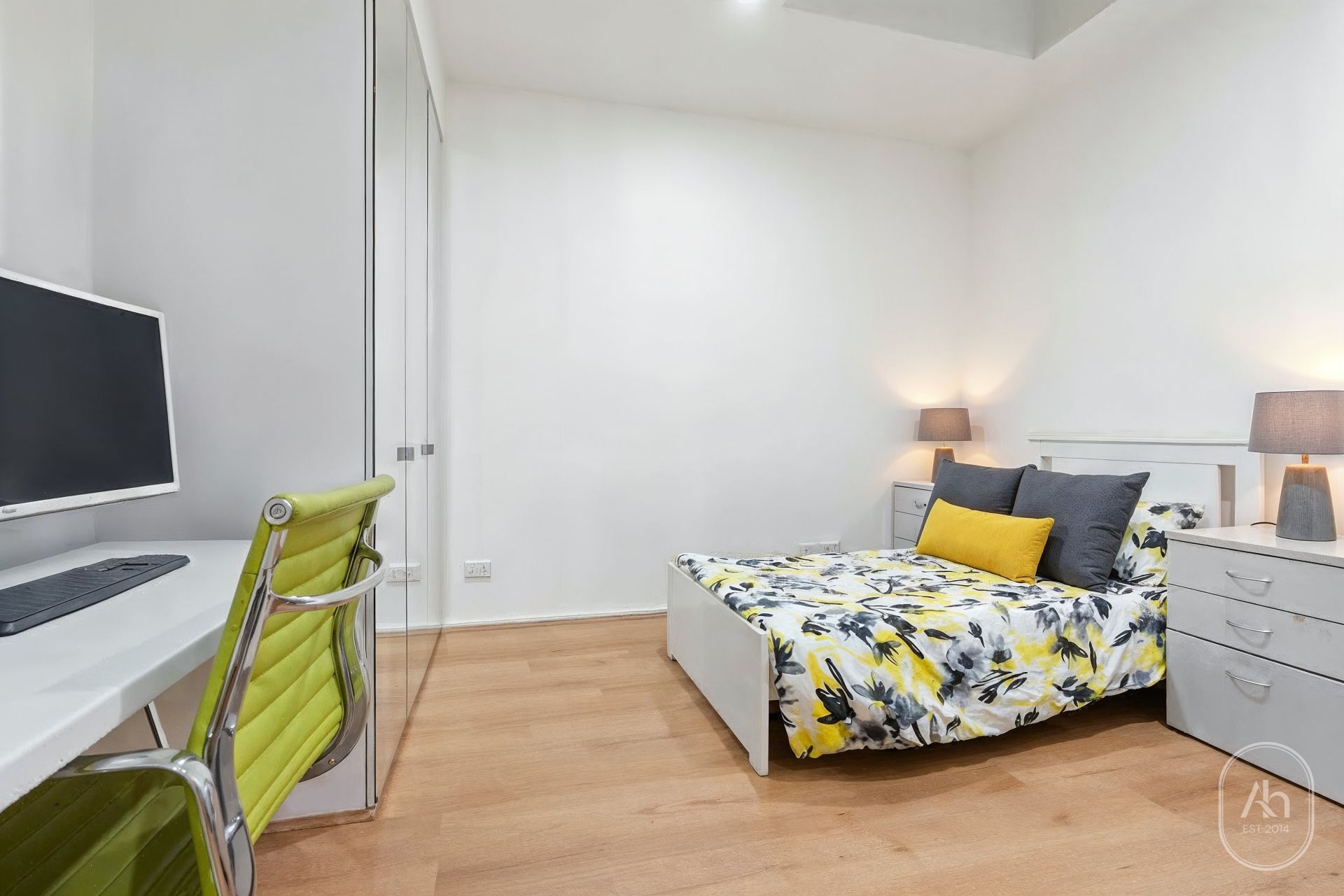 Both bedrooms are thoughtfully designed, complete with built-in robes and study desks, providing comfort and practicality for students or professionals. The central bathroom is fitted with modern finishes and a glass-enclosed shower, while a European laundry adds convenience to this well-appointed city residence.