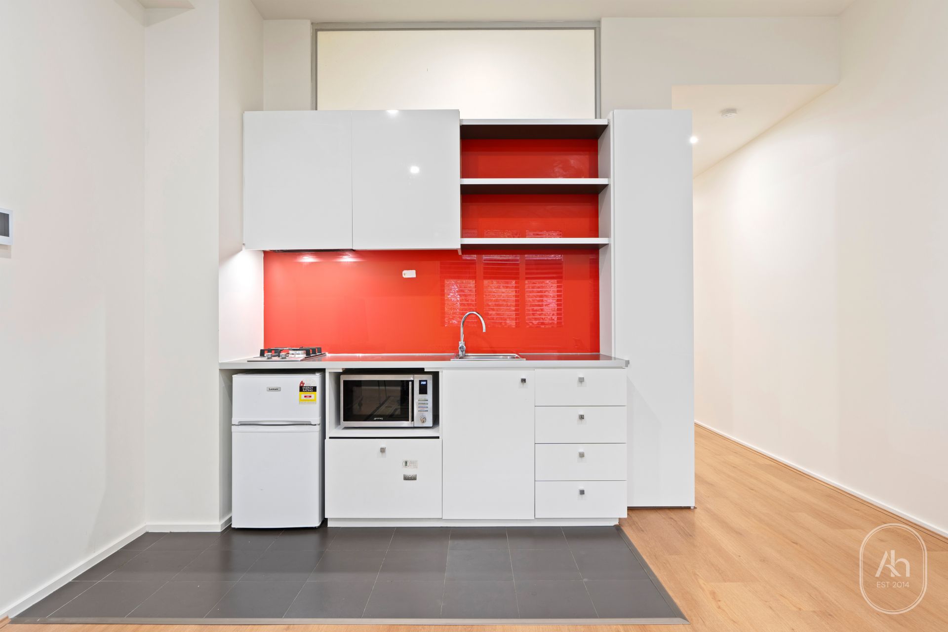 The spacious open-plan living and dining area features large windows that invite natural light, creating a warm and welcoming atmosphere. The contemporary kitchen stands out with its striking red splashback, sleek white cabinetry, quality appliances, and generous storage space — ideal for easy everyday living.