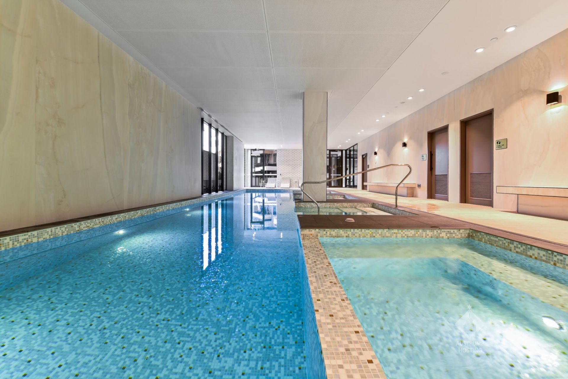 - Complex cinema, indoor pool/spa, sauna and fully equipped gym