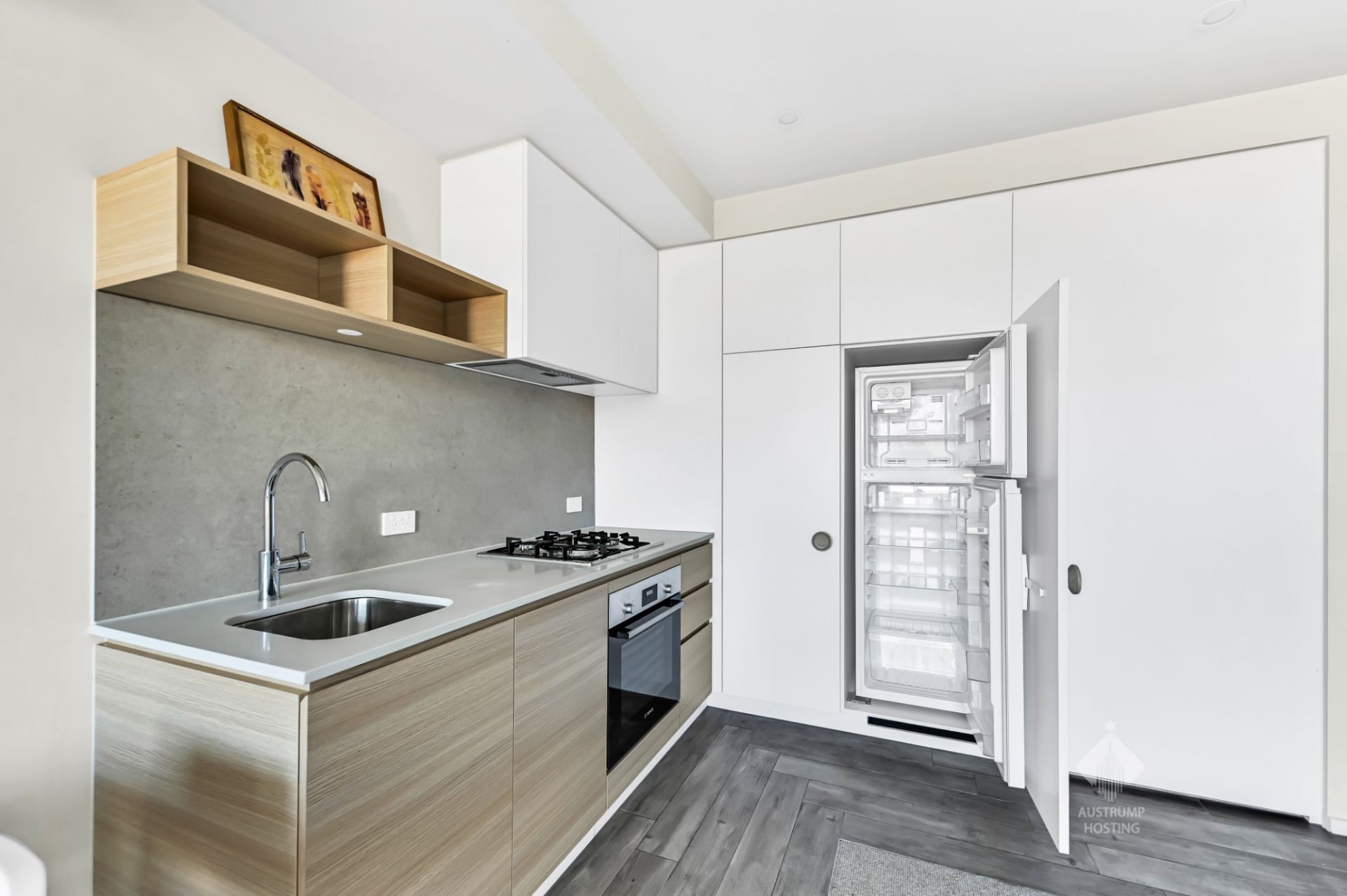 - Kitchen with gas cooktop/electric oven, dishwasher, fridge/freezer