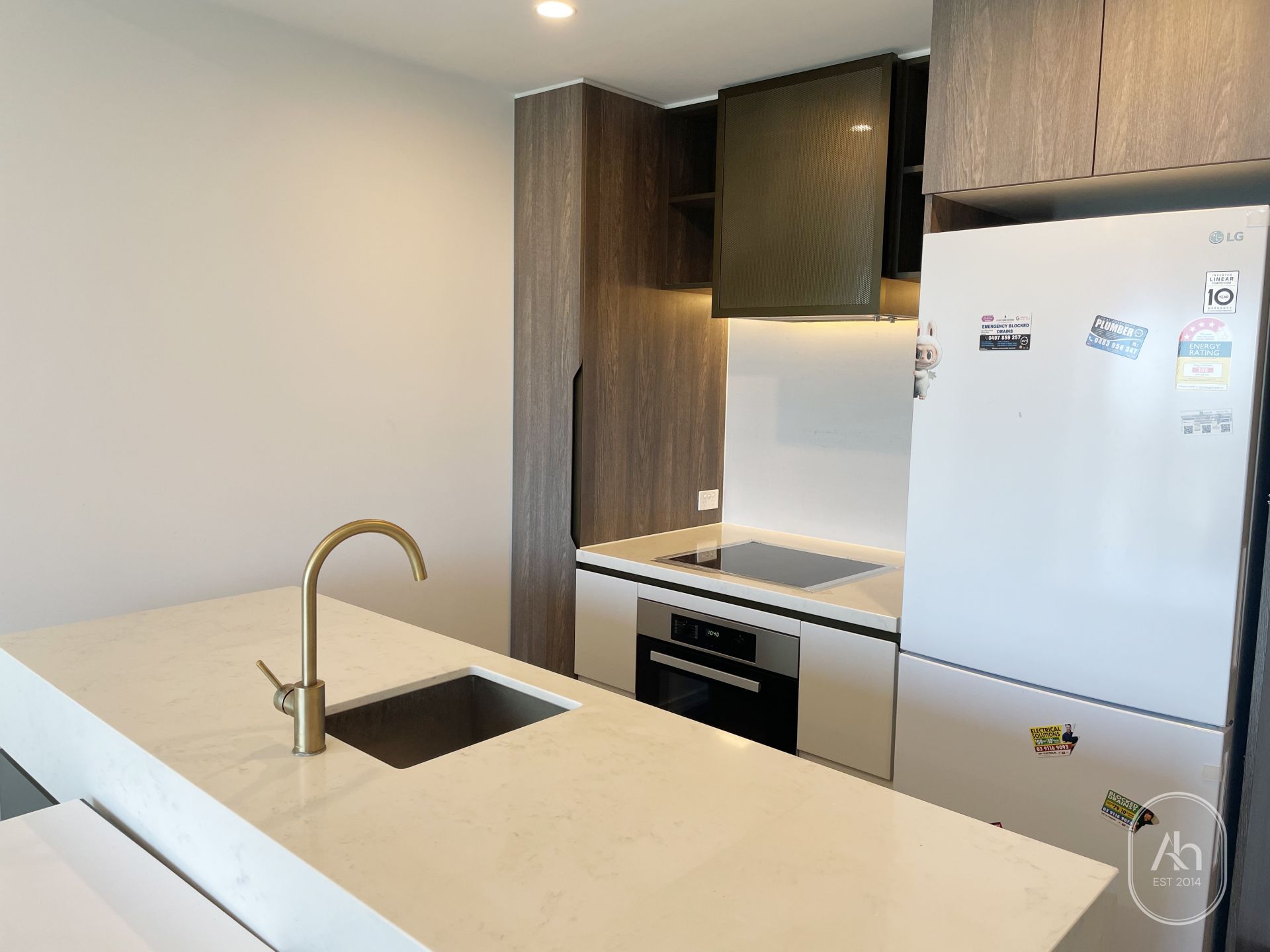 The apartment features a light-filled open-plan living and dining area, complemented by a contemporary kitchen equipped with quality appliances, stone benchtops, and ample storage. Floor-to-ceiling windows enhance natural light and create a bright, welcoming living environment.