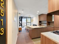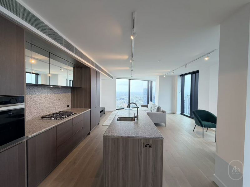 The apartment features a light-filled open-plan living and dining area, complemented by a contemporary kitchen with quality appliances, stone benchtops, and ample storage. Floor-to-ceiling windows enhance natural light and provide impressive city views, creating a bright and welcoming living environment.